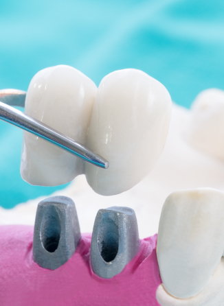 Puente fijo: Prótesis fija que reemplaza piezas dentarias con uno artificial. Se une a las piezas dentarias adyacentes ubicadas de cada lado de él.
